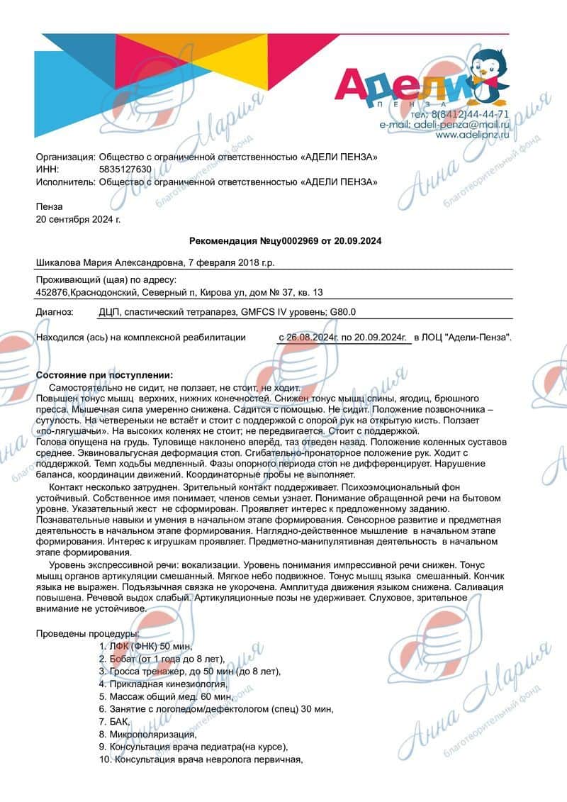 Семью полностью обеспечивает муж, он работает на шахте проходчиком. Провел год на СВО, после был списан по состоянию здоровья. Прошел лечение, но болезнь все равно дает о себе знать. Ирина не работает – все свободное время уходит на воспитание и уход за детьми. На данный момент Маше требуется пройти курс реабилитации в ФОЦ «Адели». Врачи сказали, что такой курс ей требуется проходить каждые 3 месяца, не менее 3-4 раз в год. Родители маленькой Маши просят помочь всех неравнодушных людей и принять участие в сборе средств от нашего фонда. Чем быстрее мы соберем нужную сумму, тем быстрее девочка сможет пройти такой нужный ей курс реабилитации!