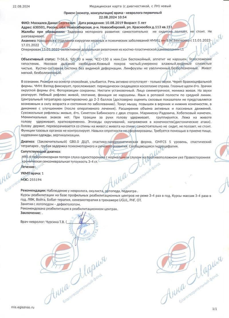 Данил посещал массаж, проходил физиотерапию, но его состояние не становилось лучше, а ухудшалось. Временами ему было очень больно – он часто жаловался, кричал от спазмов днем и ночью, изгибался дугой. Смотреть на это без слез было страшно.