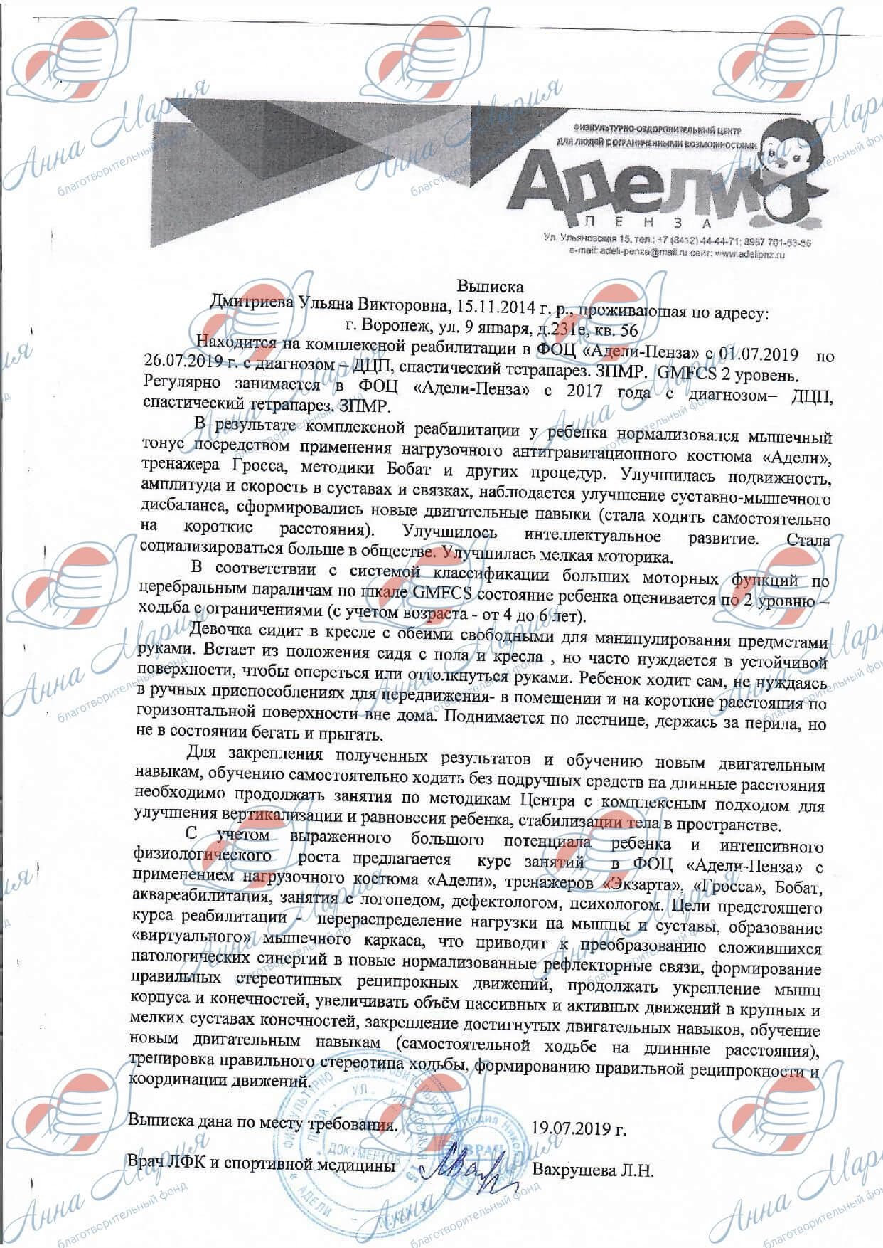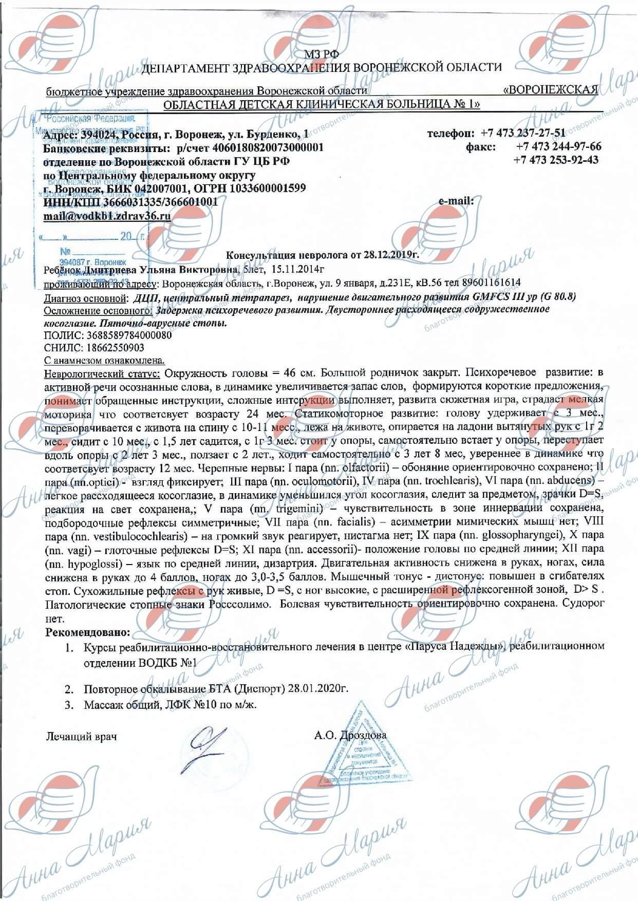 Каждые 3 месяца Ульяна проходила стационарное лечение, курсы массажа и ЛФК на дому, посещала специалистов. В 10 месяцев Ульяне поставили диагноз – нижний парапарез, задержка психомоторного и речевого развития. В 1 год и 3 месяца дали инвалидность и в полтора года поставили основной диагноз – ДЦП: центральный тетрапарез, задержка психоречевого развития.
