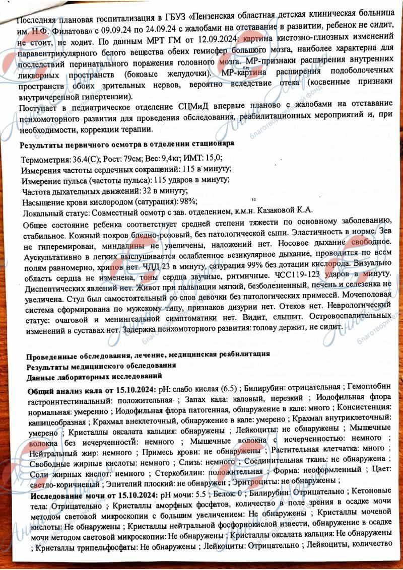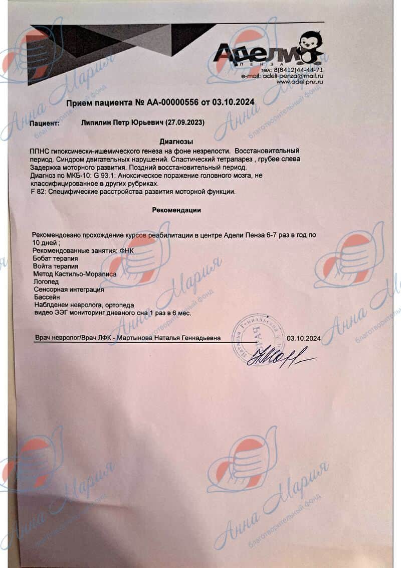 Несмотря на это, Петя отставал в развитии – перевернулся он только в 10 месяцев. Семья начала бить тревогу. В Сеченовской больнице (город Москва) врачи поставили диагноз ДЦП, спастическая диплегия. Сейчас Пете 1,1 года – он до сих пор не сидит, не ползает, не встает и не ходит. Результаты МРТ показали наличие повреждений в головном мозге, задержку моторного развития, а также сильный тонус в конечностях.