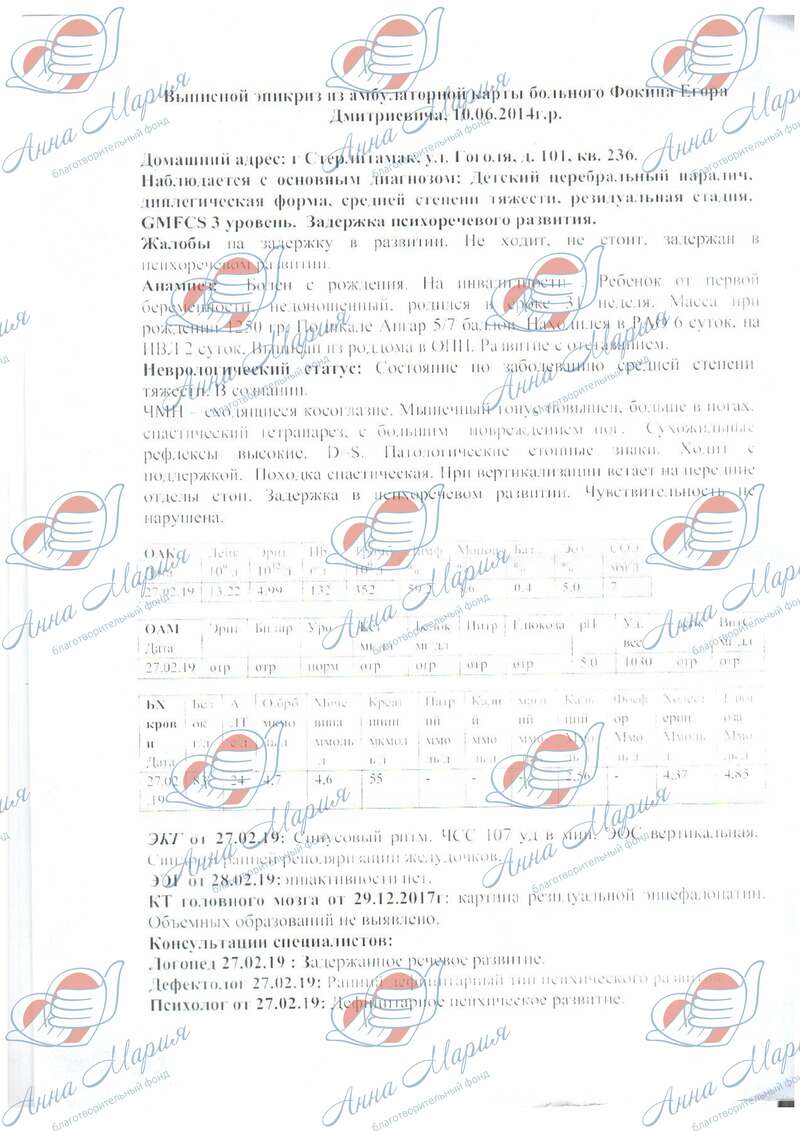 О себе: Фокин Егор родился 10 июня 2014 года, весом 1250 грамм и ростом 36 см. С самого рождения малышу пришлось бороться за свою жизнь. У мальчика ДЦП, задержка психоречевого развития. Егорка очень умный и любознательный. Потенциал восстановления у него большой при условии систематической и качественной реабилитации.