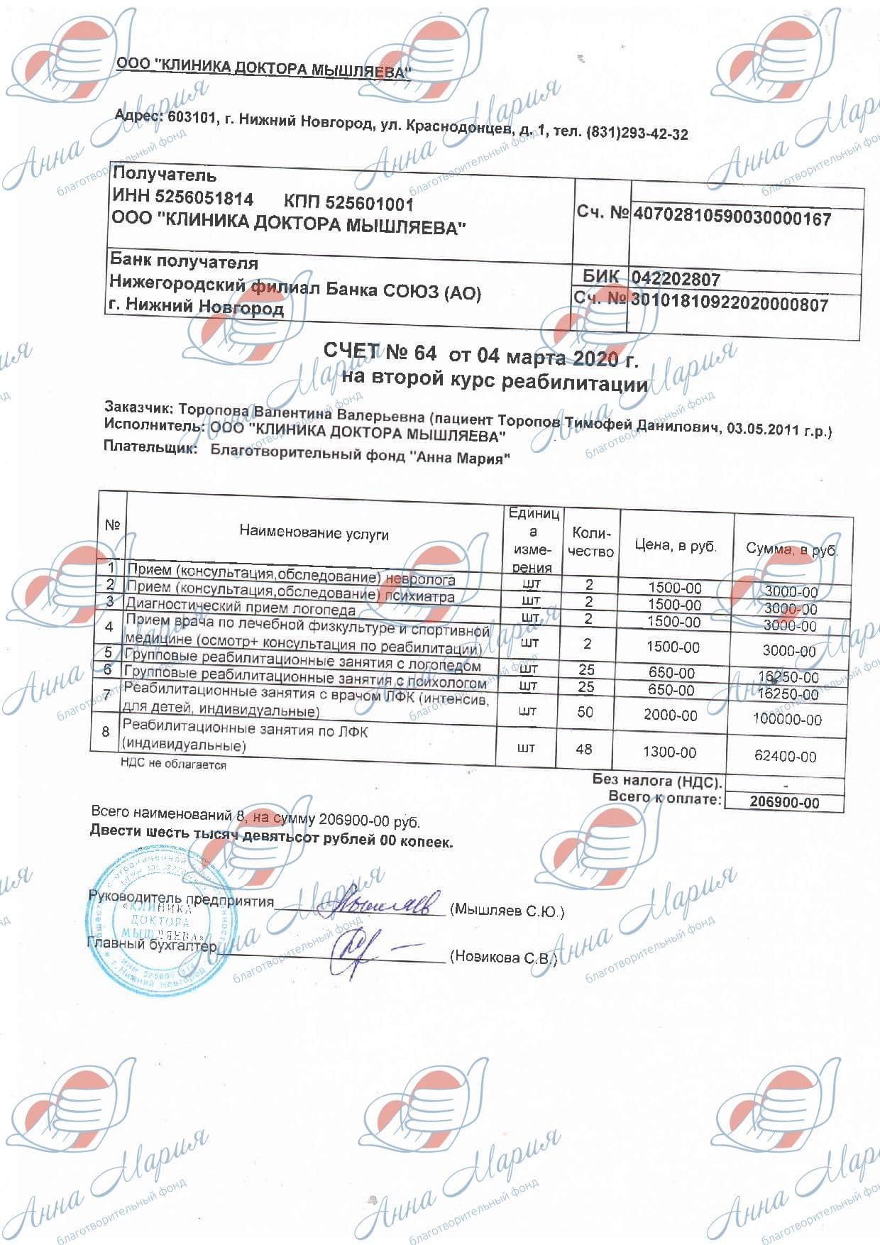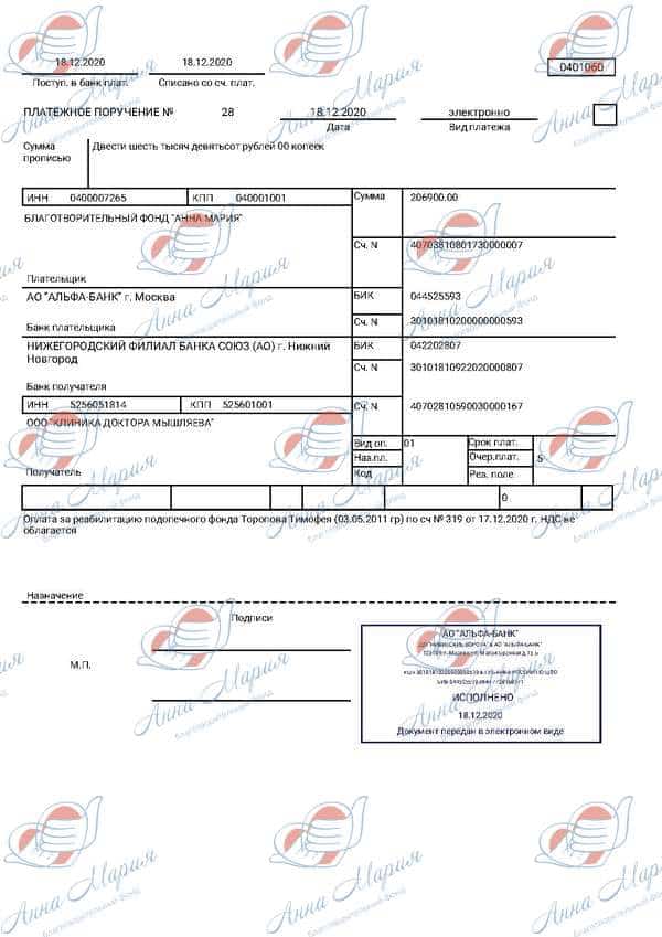 В декабре 2019 года Тимофей прошел первый курс реабилитации в «Клинике доктора Мышляева», лечение длилось почти 2 месяца. У ребенка появились первые осознанные звуки. На просьбу сказать «мама», Тимошка говорит «ам», на «папа» - «ап». Это огромная победа! За 6 лет применялись разные методики лечения, и все они давали результаты, но, к сожалению, не одно лечение не помогало в стимуляции речи. Тимку ждут в «Клинике доктора Мышляева» на 2 курс! Для родителей – это надежда на счастливое будущее их сына.