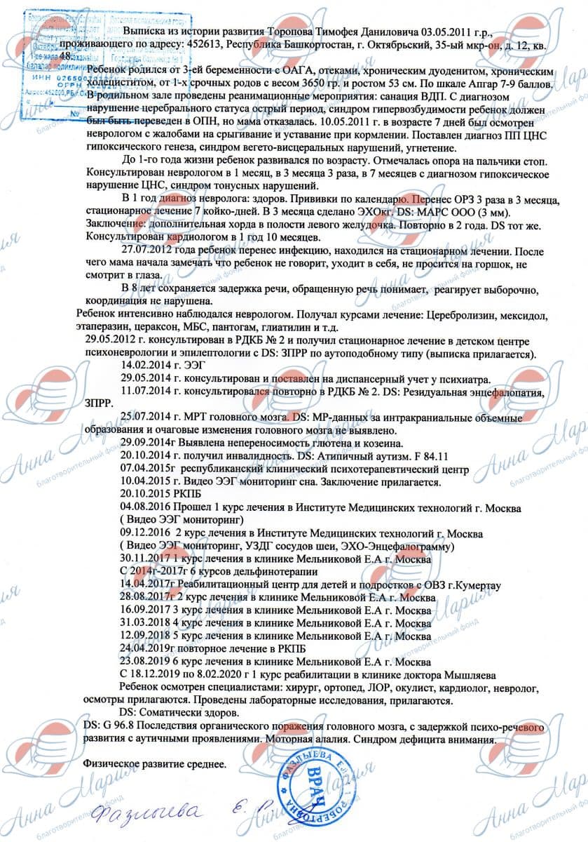 Диагноз Тимофею поставили в 1,5 года. С этого момента начались занятия с дефектологом, логопедом и психологом. Проходили лечение в Институте медицинских технологий в Москве, в реабилитационном центре в Уфе, прошли 6 курсов дельфинотерапии, реабилитации в клинике Мельниковой в Москве. Тимоша большой молодец, он стойко, как настоящий мужчина, выдерживает постоянные курсы реабилитаций и уколы.