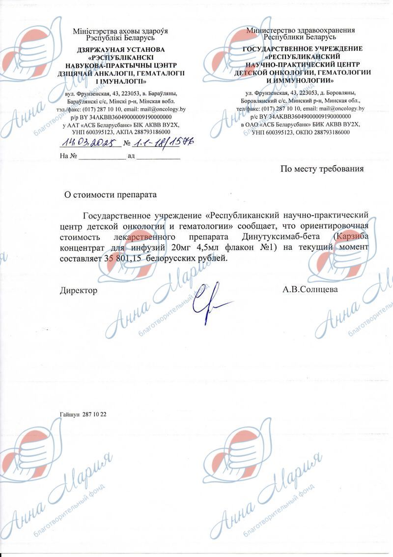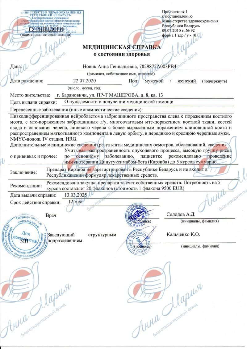 На данный момент Аня проходит лечение в РНПЦ детской онкологии, гематологии и иммунологии в г. Минск – она находится в больнице по настоящее время.