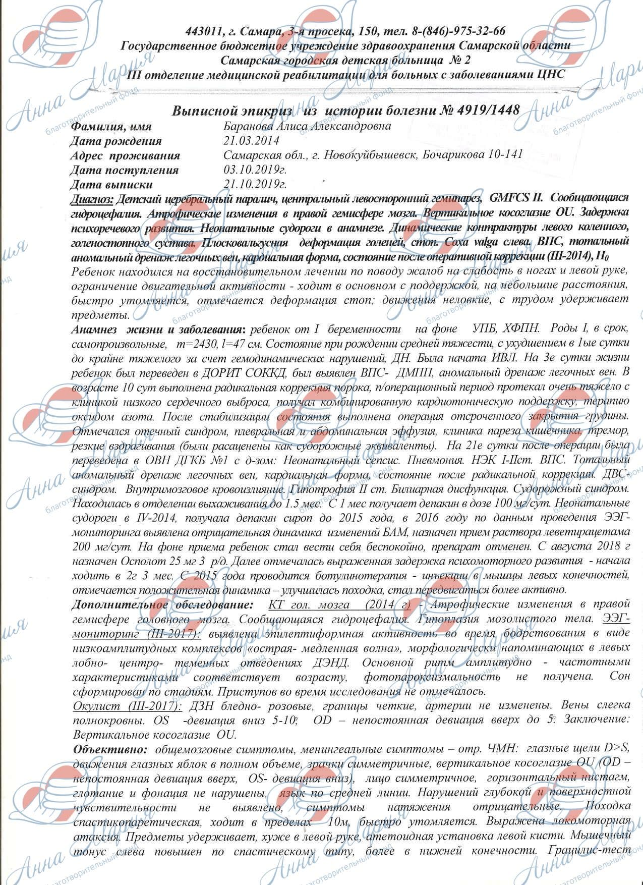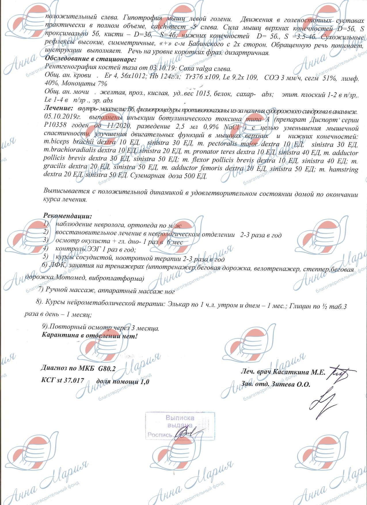 В результате лечения Алиса стала более уверенно ходить, меньше подволакивает левую спастичную ногу, активнее привлекает в играх левую ручку, в речи появились простые предложения. В общем развитии появилась положительная динамика.