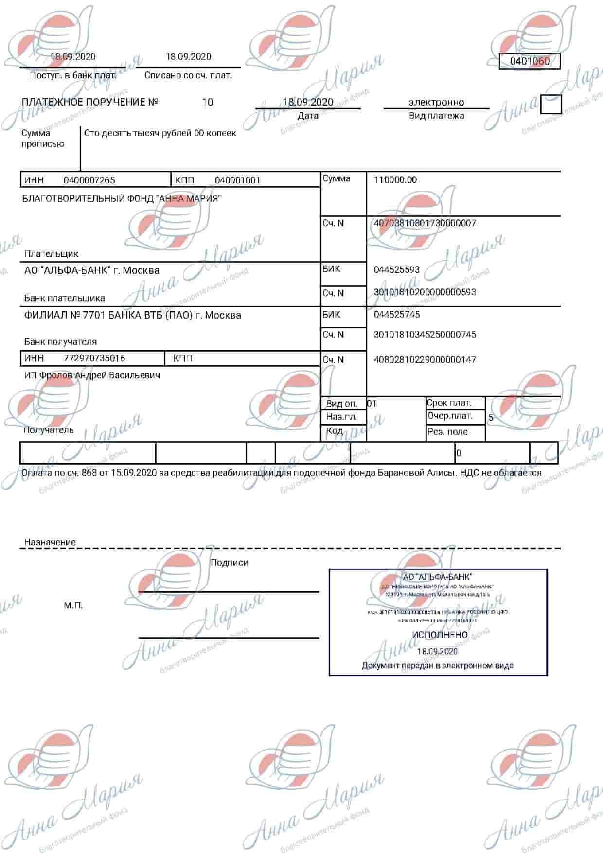 В июле 2020 года Алиса записана на курс реабилитационного лечения в МЦ «Первый шаг» в Казани. Стоимость одного курса 150 600 рублей.