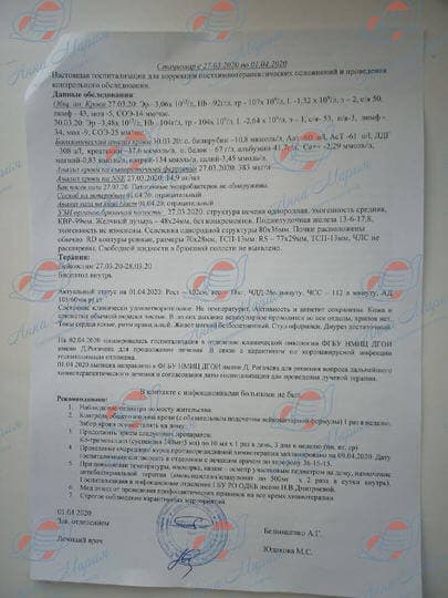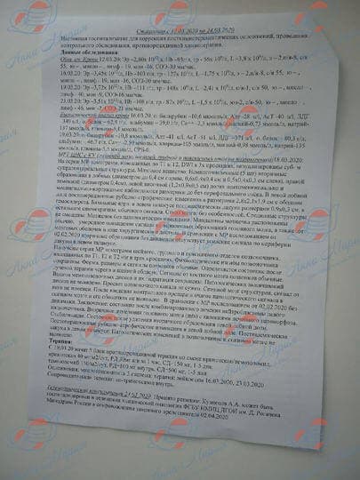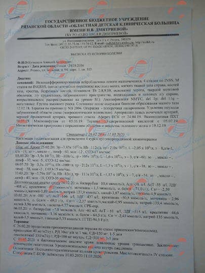 По результатам дальнейшего обследования, был диагностирован изолированный рецидив ЦНС: очаги по оболочке головного мозга. Сейчас мы проходим химиотерапию по схеме иринотекан/темодал. Далее планируется лучевая терапия на спинной и головной мозг.