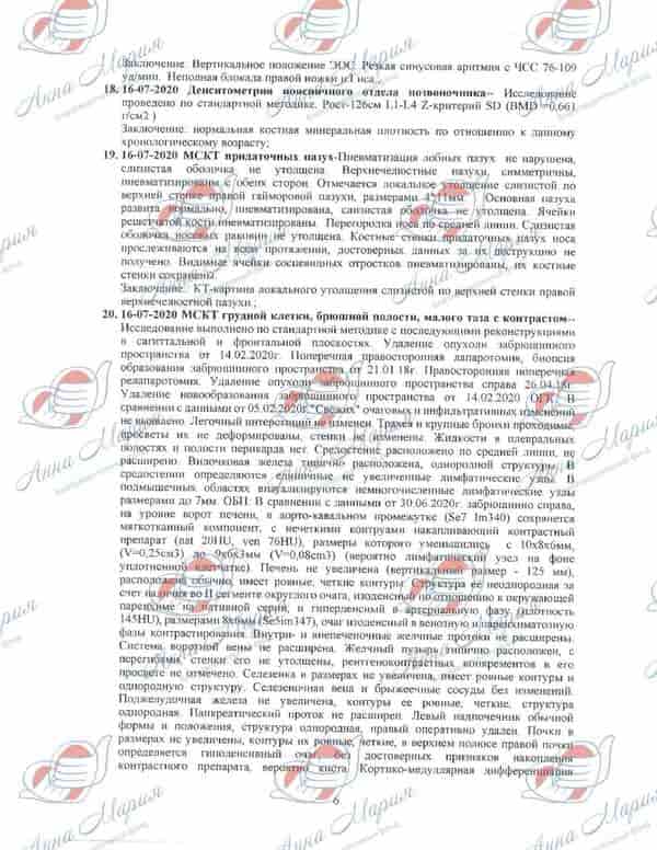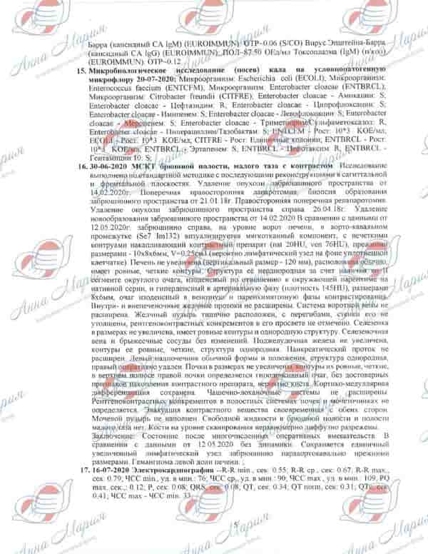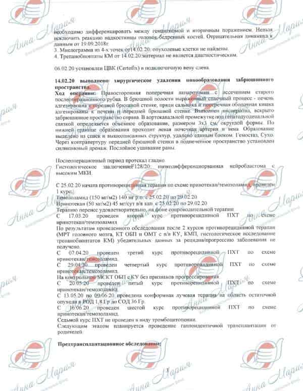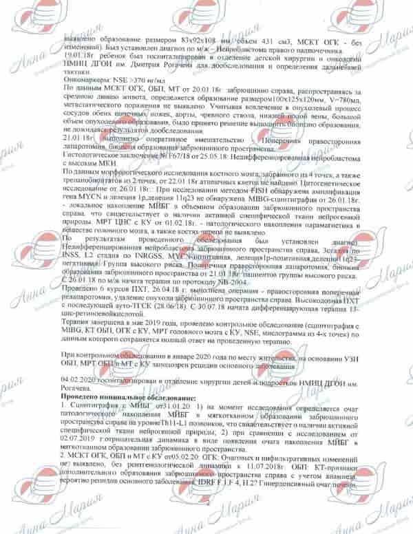На основании всех проведенных исследований (УЗИ, биопсия, пункция костного мозга, КТ, МРТ, MIBG, сцинтиграфия) ранее установленный диагноз подтвердился: недифференцированная нейробластома забрюшинного пространства справа, 3 стадия по INSS MYCN- положительная. Группа высокого риска.