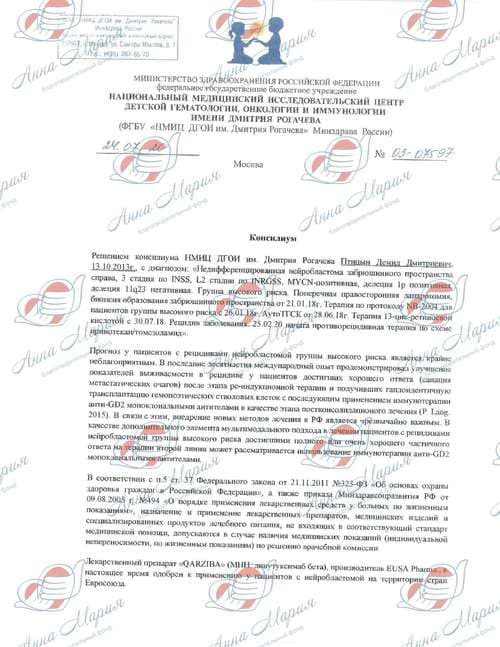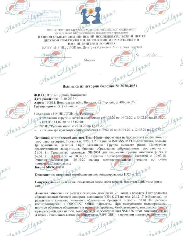 С 26.01.2018 Демиду начали проводить терапию по протоколу NB-2004 для группы высокого риска, проведено 6 курсов химиотерапии, опухоль сократилась. 26.04.2018 выполнена операция по удалению остатков опухоли. Демид прошел высокодозную ПХТ, а 28.06.2018 проведена аутологичная трансплантация периферических гемопоэтических стволовых клеток. С 30.07.18 г. была начата дифференцирующая терапия 13-цис-ретиноевой кислотой, которая завершилась в мае 2019 года.