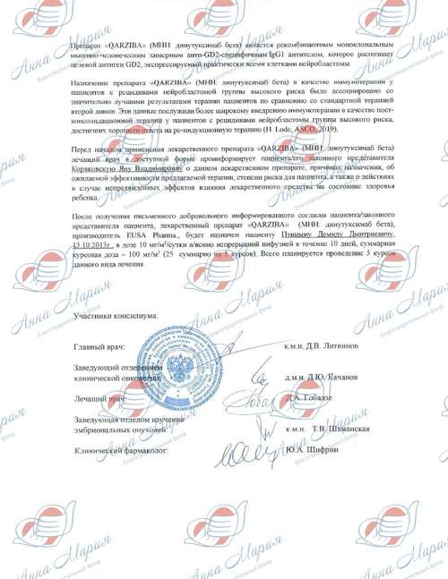 В лечении пациентов с рецидивами нейробластомы группы высокого риска, которые достигли как Демид, полного ответа на терапию второй линии, очень важен мультимодальный подход. Сначала ре-индукционная терапия, потом гаплотрансплантация и далее использование иммунотерапии анти-GD2 моноклональными антителами.