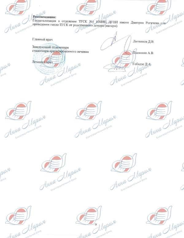 Операция по удалению образования прошла хорошо. Начата противорецидивная терапия. В общей сложности Демид прошел 6 курсов химиотерапии и лучевую терапию. Промежуточные контрольные обследования показали отличные результаты. В связи с этим врачи НМИЦ ДГОИ им. Дмитрия Рогачева решили провести гаплоидентичную трансплантацию, где донором буду я, мама.