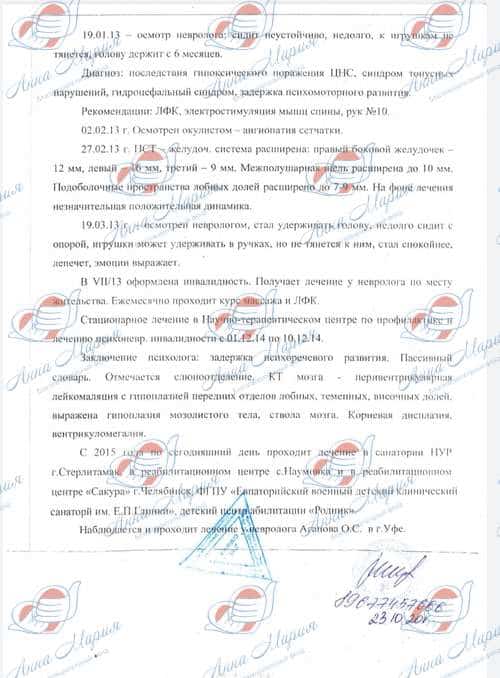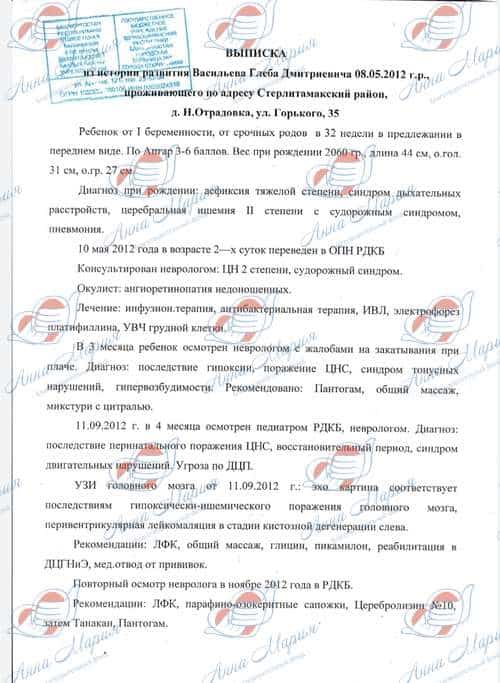 Малыш был выписан домой в удовлетворительном состоянии с угрозой по развитию перинатальной патологии ЦНС, имунно-эндокринной дисфункцией, ретинопатией недоношенных и угрозой по формированию ДЦП. Четвертого июля 2013 года присвоена группа инвалидности с диагнозом ДЦП - последствия перинатального поражения ЦНС в стадии субкомпенсации, спастического тетрапареза, задержка моторного и психоречевого развития.