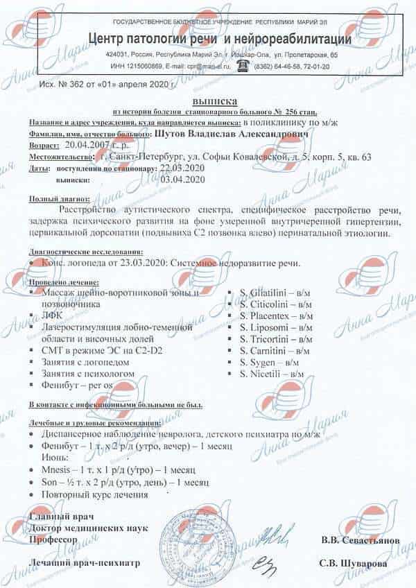 Одним из таких центров является НЦ ПрогнозМед «Доктрина». Влад с удовольствием ходит на занятия, все процедуры выполняет спокойно, с терпением и без присутствия родителей. Особенно любит ЛФК. Родители и специалисты центра видят положительную динамику в развитии ребенка. Влад научился слышать и слушать, причем делает это осознанно. Выполняет просьбы. Учитывая его диагноз - это огромный результат! Ушла гиперактивность. Влад живет на общении без слов. Свои действия, желания он показывает карточкой или жестом. Ребенок пользуется альбомом Пекс для аутистов. И все-таки есть надежда, что когда-нибудь Влад заменит карточки речью!