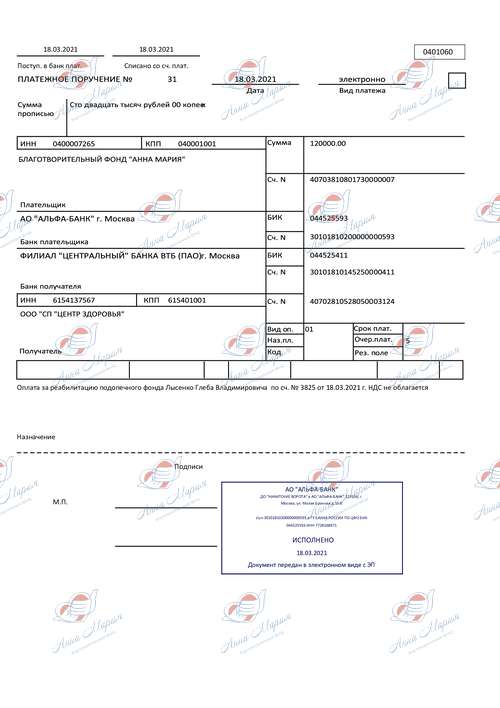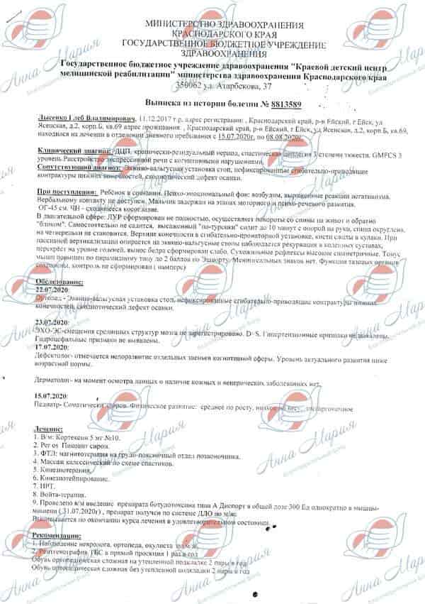 Лечение не давало результатов. В 4 месяца у Глеба развилось косоглазие. По результатам обследования в Краснодарском детском диагностическом центре были установлены признаки ДЦП. На тот момент Глебу было полгода. Родителям сложно было в это поверить, но отчаиваться не было времени. Началось интенсивное лечение совмещенное с массажами и ЛФК! До последнего родители надеялись на ошибку врачей в диагнозе. После прохождения реабилитации в Краевом детском центре "Солнышко", в Краснодаре, сомнений не осталось – у малыша ДЦП: спастическая диплегия.