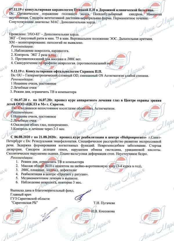 С ребенком занимались ежедневно и специалисты, и родители! Предприняты максимальные усилия для восстановления здоровья ребенка. Многочисленные обследования, курсы реабилитаций, санатории, плавание, дельфинотерапия, иппотерапия, развивающие занятия с логопедом, психологом и дефектологом – все это дало огромные результаты. Миша научился сидеть, ходить, появилась речь! Но повреждения головного мозга не проходят без последствий! Ребенку необходимо адаптироваться к жизни, научиться хорошо говорить, мыслить! Именно поэтому, очень важно не останавливаться на достигнутом и продолжать курсы реабилитаций. Ведь прогнозы врачей говорят о том, что при условии дальнейшего лечения, Мишенька будет здоровым ребенком и сможет жить полноценной жизнью!