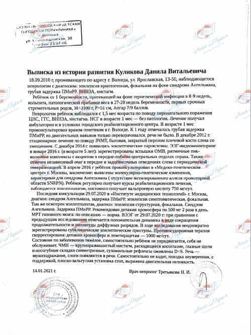 По рекомендациям родители обратились за помощью в клинику GMS Clinic в Москве. Врачебный консилиум длился целых 4 часа. В результате был поставлен диагноз: Синдром Ангельмана. Это редкое генетическое заболевание. В связи с этим постановка диагноза и оказание медико-психолого-педагогической помощи зачастую проводятся несвоевременно, к 6-8 годам, что обуславливает низкую успешность коррекционных и лечебных мероприятий.