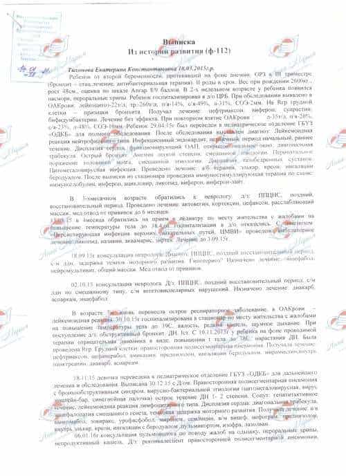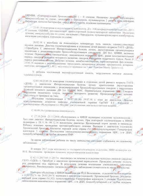 «Катюша наш второй долгожданный ребенок. Проблемы со здоровьем начались с самого рождения. Ребенок неоднократно перенес пневмонию. Оренбургские врачи затруднялись установить причину шумного дыхания малышки. Лечение не приносило результатов, состояние дочки только ухудшалось, несмотря на гормонотерапию, постоянные ингаляции, которую назначили врачи. Моя девочка испытывала трудности с дыханием, особенно по утрам из-за скопившейся мокроты. В ноябре 2016 года нас отправили на обследование в НИКИ педиатрии им. академика Ю.Е. Вельтищева ФГАОУ ВО РНИМУ им. Н.И. Пирогова. Обследование длилась полтора месяца, в результате были выставлены такие диагнозы: ателектаз верхней доли справа; гипертрофия аденоидов 3 степени; последствия гипоксически-ишемического поражения ЦНС; синдром ДЦП; микроцефалия; грубая задержка ПМР.