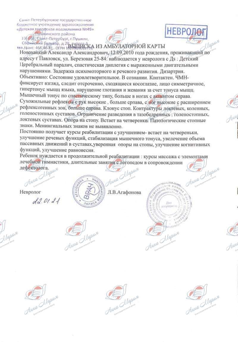 История: Двойняшки Александр и Юлия Новохацкие родились 12 сентября 2010 года. Дети появились на свет раньше срока - в 29 недель в результате кесарева сечения. Саша родился первым, сразу закричал, а Юля не дышала, ее отвезли в реанимацию. Спустя неделю после рождения у Саши упала сатурация, началось кислородное голодание, гипоксия. Ребенок не получил вовремя кислородную маску. И, как следствие, малыш получил диагноз ДЦП. Позднее прибавилась проблема со зрением. У недоношенных детей возможна отслойка сетчатки. Проведена операция на глазах, зрение удалось спасти лишь на 50%. Юля же через год после рождения, догнала своих сверстников и развивается по возрасту. Сейчас учится в третьем классе общеобразовательной школы.