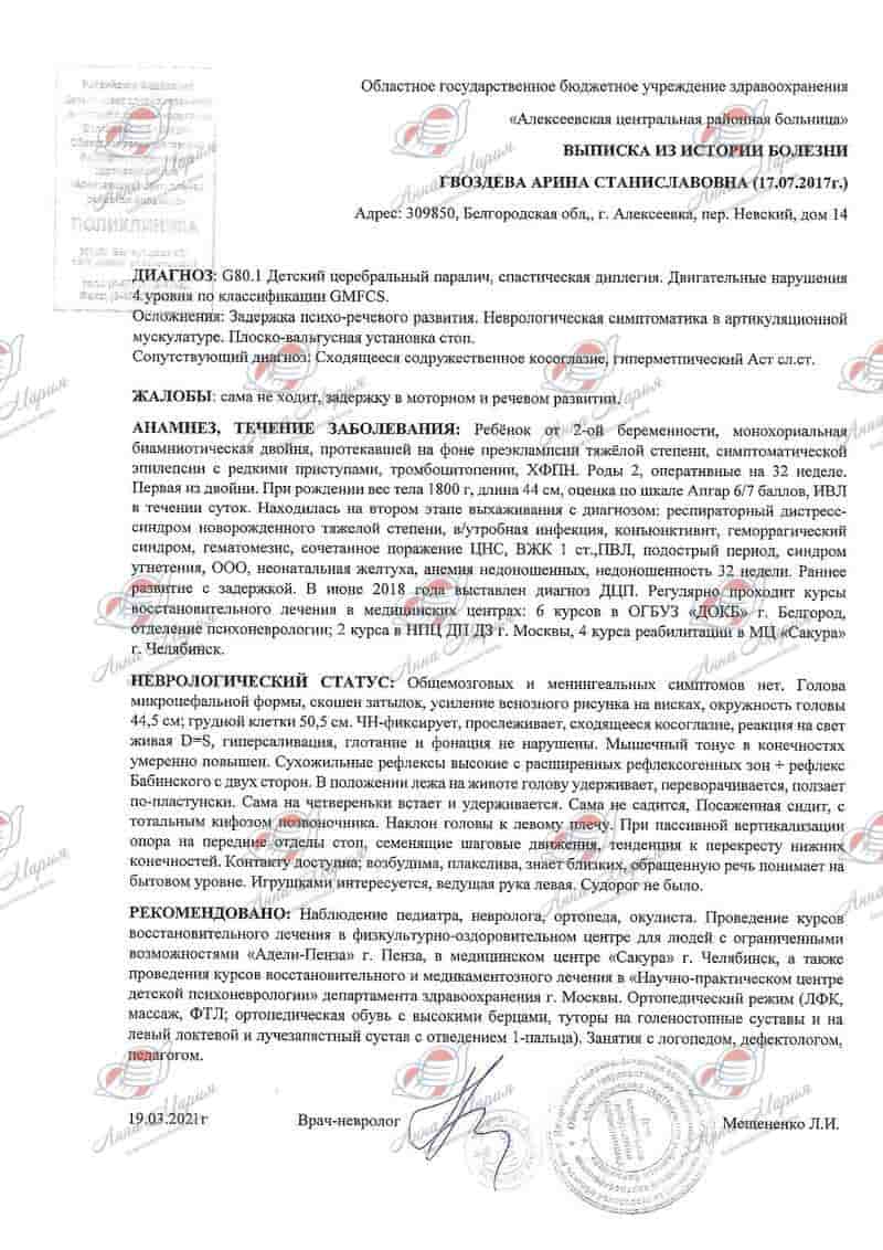 О себе: Гвоздева Арина родилась 17 июля 2017 года в г. Алексеевка Белгородской области. В результате патологического течения беременности девочка родилась недоношенной. В 11 месяцев Арине диагностировали детский церебральный паралич.