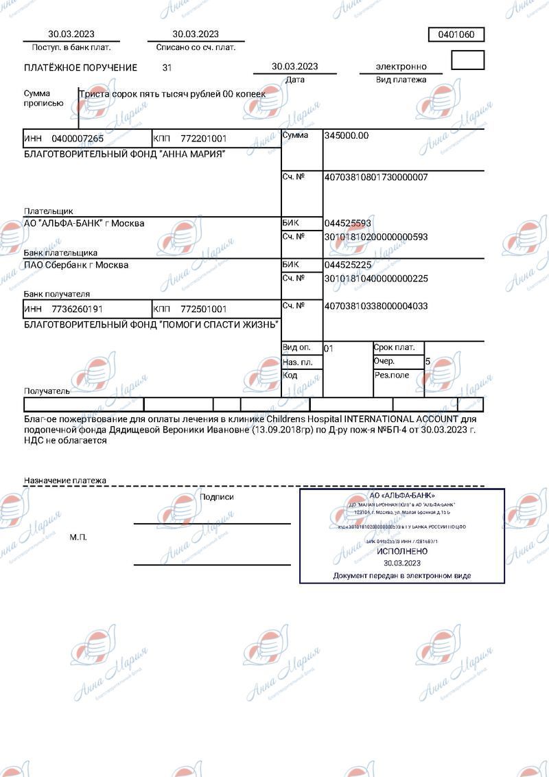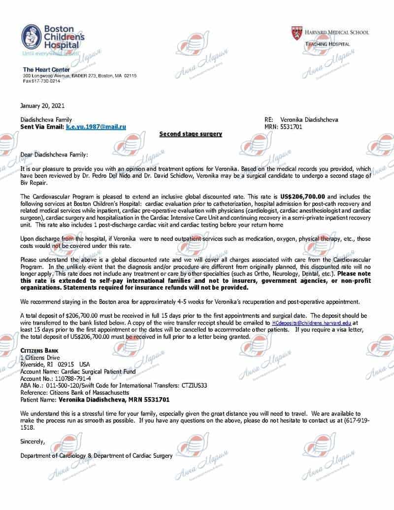 Маме Вероники из клиники поступили документы по оплате. В соответствии с этими документами платёж в клинику должен поступить минимум за 21 день до первого приема. Предположительные даты операции - июль, как и рекомендовал врач.