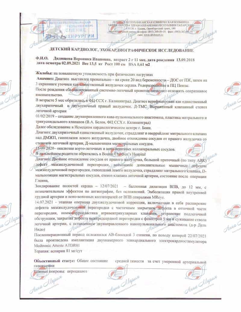 У Вероники все хорошо. Вероника записана на приём к кардиологу в г.Казань. 10 декабря состоится приём. Все настраиваются только на лучшие результаты.