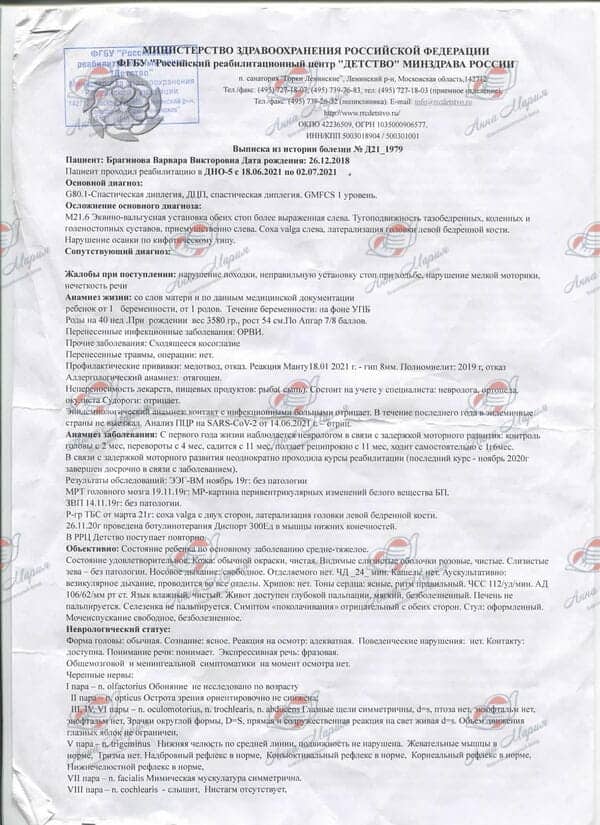 Варвара росла обычным ребенком, но, когда пришло время по возрасту самостоятельно сидеть – этого не произошло, ползать она тоже не пыталась. Стало очевидным, что Варвара не сможет своевременно сделать свои первые шаги. Мама обратилась к докторам с жалобами на отставание ребенка в физическом развитии.