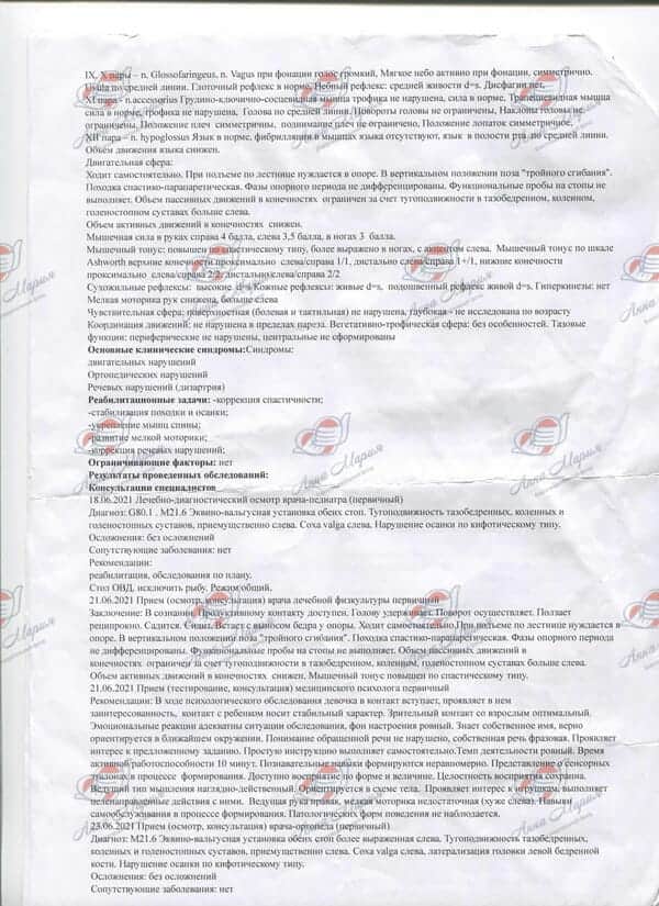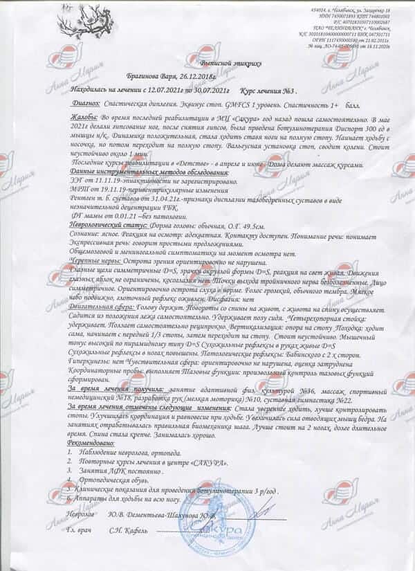Девочку обследовали в ФГАУ «НМИЦ» в Москве. Мама поверить не могла, когда услышала, что у дочери «детский церебральный паралич». Она понимала, что каждый день бездействия может только навредить дочери. С этого момента начались поиски эффективного лечения. А каждый прожитый день – это борьба за здоровое будущее дочери: постоянные ЛФК, массажи и физеопроцедуры.