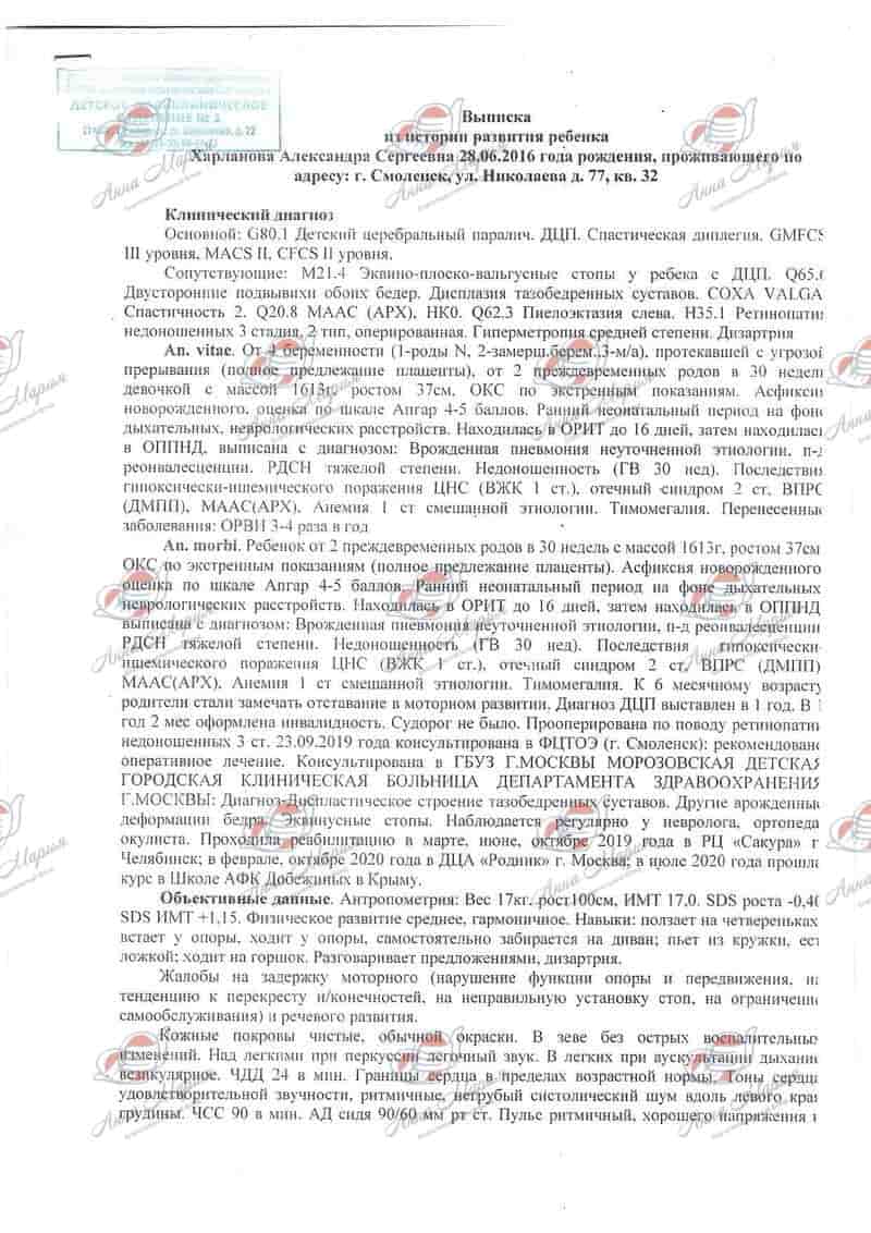 История: «Наша любимая дочь Харланова Александра Сергеевна родилась 28 июня 2016 года раньше срока. Родилась крохой с весом 1,613 кг, ростом 37 см. В процессе родов развилась острая гипоксия. Две недели она лежала в реанимации под аппаратом искусственной вентиляции легких. Тяжело вспоминать это время… Мы очень переживали за жизнь нашей крохи. И сколько было радости, когда она через полторы недели самостоятельно задышала и её отключили от аппарата. Затем нас ждал длительный этап выхаживания в роддоме Смоленска в отделении патологии недоношенных.