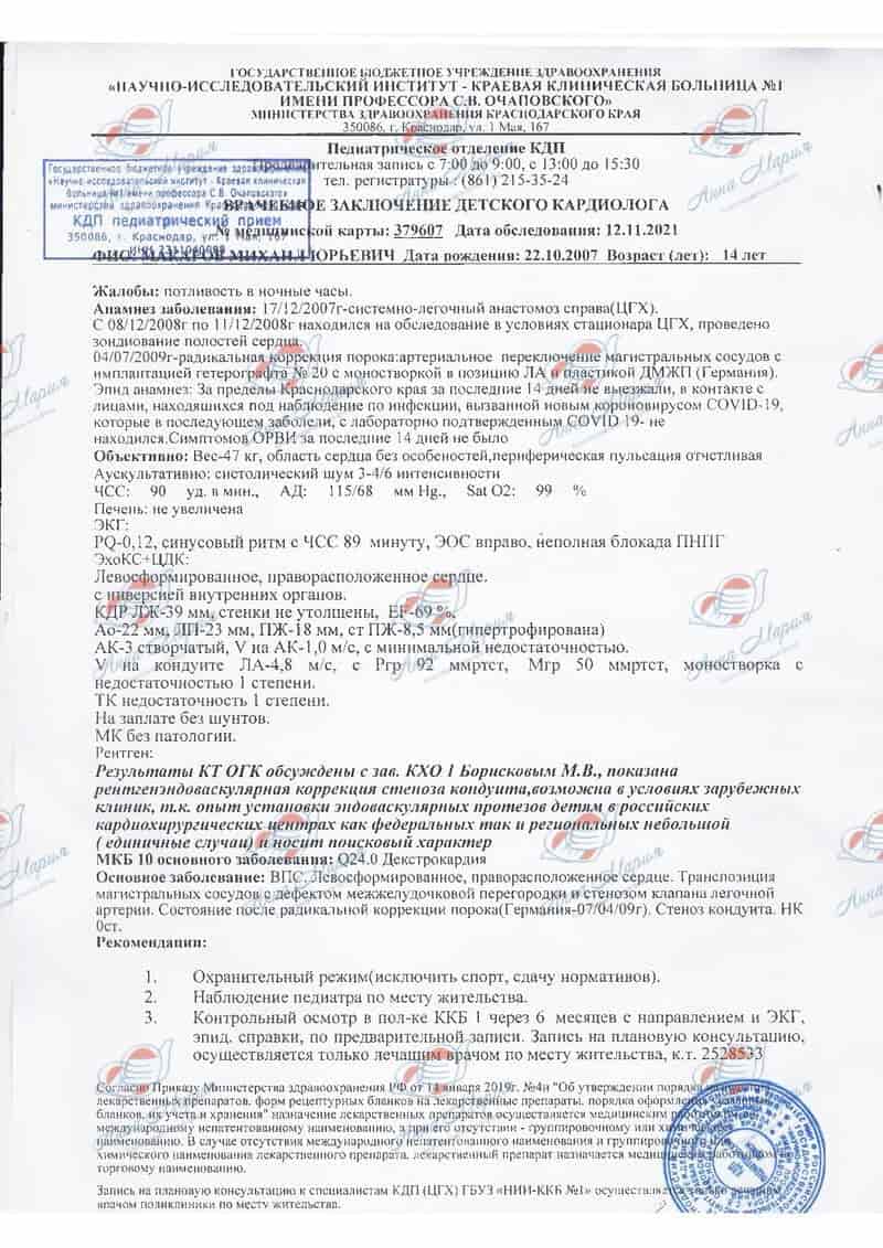 На последнем УЗИ и КТ сердца был выявлен стеноз лёгочного клапана и показана рентгенэндоваскулярная коррекция стеноза кондуита. Врачи рекомендовали лечение в зарубежных клиниках, поскольку, в связи с неправильным расположением сердца и сложным пороком, подобные операции в России не проводятся. Приемущество рентгенэндоваскулярной хирургии заключается в том, что ребёнку не будут снова останавливать сердце, менять клапан и осуществлять тяжёлую операцию на открытом сердце, а расширят существующий лёгочный клапан с помощью катетера и поставят в него металлический стент, чтобы клапан больше не сужался. Эта операция, настолько щадящая для пациента, что даже не требует послеоперационной реанимации.